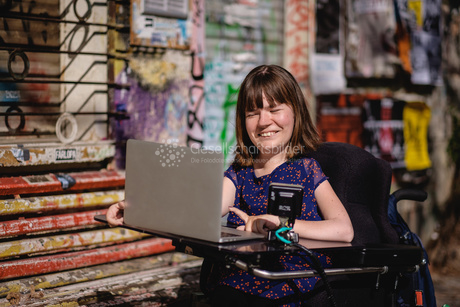 Attraktiv, Attraktivität, Außenaufnahme, Behinderung, Computer, E-Rolli, E-Rollstuhl, Einzelportrait, Erwachsene, Farbbild, Frau, Frau mit Behinderung, Freude, Fröhlich, Glücklich, Glücklichsein, Journalistin, Lachen, Lebensfreude, Mensch mit Behinderung, Motivation, Positive Energie, Querformat, Rollstuhl, Rollstuhlfahrerin, Selbstbestimmt, Selbstbewusstsein, attraktive Frau, erwachsene Person, horizontal, im Freien, junge Frau, lächeln, motiviert, selbstbestimmtes Leben, selbstbewusst